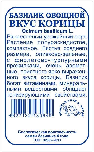 Раннеспелый высокоурожайный сорт для открытого грунта, парников и подоконников. От всходов до сбора листьев около 30 дней. Растения полураскидистые, высотой 35-40 см. Листья среднего размера, оливково-зеленого цвета с выразительными фиолетовыми прожилками, ароматные, с интересным и запоминающимся вкусом корицы. Базилик богат витаминами и минеральными веществами, обладает тонизирующими свойствами. Одна из самых популярных приправ.