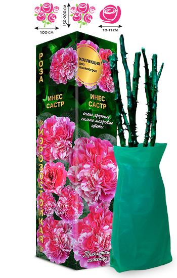Куст высотой около 150-200 см, с темно-зелеными, глянцевыми листьями среднего размера. Цветы диаметром 10-11 см, насыщенно-розового цвета с белыми и кремовыми штрихами, густомахровые, собраны соцветиями по 5-10 шт. Аромат интенсивный, с приятными нотками яблока. Отличная устойчивость к болезням и морозам.
