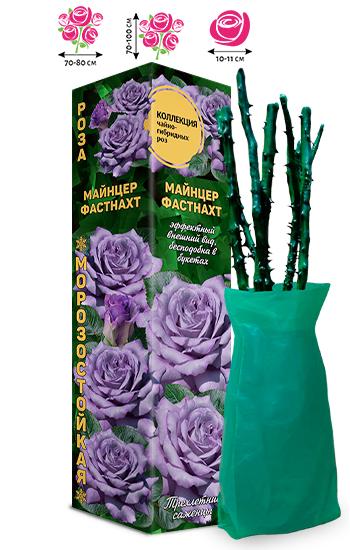 Куст прямостоячий высотой 70-100 см. Изящные высокие бутоны фиолетово-сиреневого цвета, распускаясь, меняют цвет на серебристо-сиреневый или сиренево-пурпурный. Цветки диаметром 10-11 см бледно-лиловые. На солнце оттенок более голубой, в тени розовее. Аромат сильный. Шипов мало. Цветение обильное до осени.