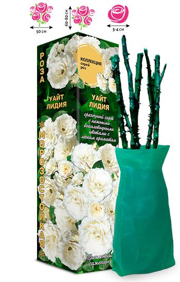 Кустики компактные и среднерослые, максимальная высота взрослого растения около 80 см, а ширина до 40 см. Листочки у сорта правильной овальной формы, насыщенного темно-зеленого цвета, мелкие, глянцевые. Упругие стебли без шипов. Относится к срезочным сортам, так как срезав одно соцветие, можно получить аккуратный букетик. Мелкие цветки (диаметр не превышает 4 см) бокаловидной формы. На стебле образуется 5-10 соцветий, собранных в розетку нежно-белых с оттенком слоновой кости бутонов. При полном раскрытии махровые цветки становятся абсолютно белоснежными. Насыщенность цвета бледная. Роза Уайт Лидия обладает легким нежным ароматом, хотя интенсивность его слабая.