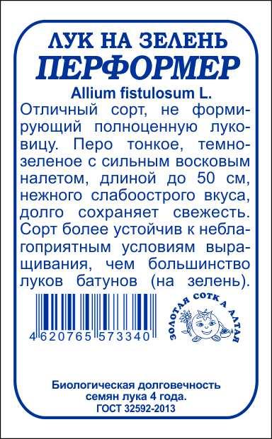 Отличный среднеспелый сорт для возделывания в открытом грунте с весны до поздней осени в однолетней культуре. Растение мощное, высотой до 60 см, не формирующее полноценную луковицу. Перо красивое, тонкое, темно-зелёной окраски с сильным восковым налётом, длиной до 50 см, нежного слабо острого вкуса, долго сохраняет свежесть и не грубеет. Сорт устойчив к листовым заболеваниям, более устойчив к неблагоприятным условиям выращивания, чем большинство луков на зелень.