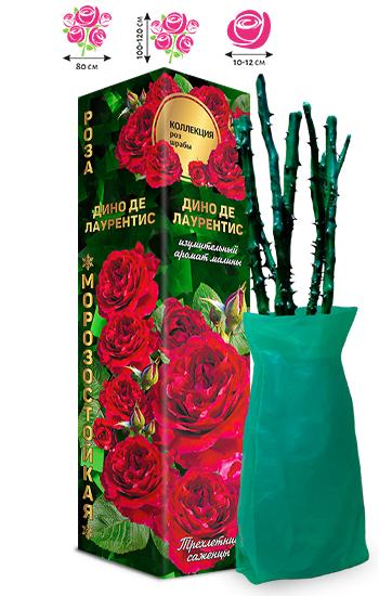 Прямостоячий ветвистый куст высотой в 100-120 см обладает светло-зелеными матовыми листьями. В период цветения его украшают яркие красные цветы старинной формы. Они крупные, диаметром в 10-12 см, густомахровые и пышные. Бутоны формируют малоцветковые соцветия, собираясь по 3-5 штук. Цветки источают приятный аромат малины. Цветение розы длительное и обильное с июня по октябрь. Розы Дино де Лаурентис используют для срезки, а также высаживают в одиночных и групповых посадках.