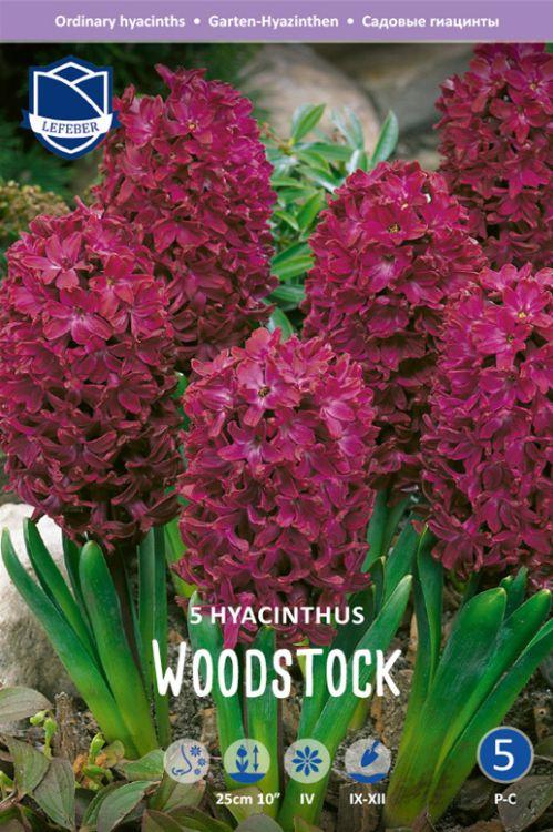 Гиацинт Вудсток относится к садовому крупноцветковому классу. Цветение гиацинта Woodstock происходит в марте-апреле, отличительная особенность от других сортов гиацинта своим незабываемым насыщенным пурпурно-лиловым окрасом с рубиновым блеском. Высота растения 25 см, высота соцветия 15-20см. Аромат у него очень стойкий, поэтому в основном сажают его вдоль аллей. Продолжительность цветения 10-15 дней. Гиацинт Вудсток прекрасно подходит для выгонки, даже для новичков, для оформления цветников весной, и на срезку. Предпочитает солнечное или слегка затененное место.