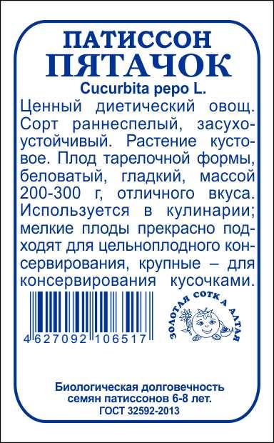 Ценный диетический овощ. Сорт раннеспелый, засухоустойчивый. Период от полных всходов до плодоношения 40-50 дней. Растение кустовое. Плоды тарелочной формы, беловатые, гладкие, массой до 200-300 г, отличного вкуса. Сорт рекомендуется для использования в домашней кулинарии и консервирования: мелкие плоды, размером с «пятачок», прекрасно подходят для цельноплодного, крупные –для консервирования кусочками.