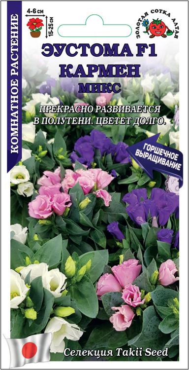 Эустомы серии «Carmen» выведены специально для выращивания в горшечной культуре, зацветают рано, цветут долго, отлично развиваются в полутени, в домашних условиях растут как многолетник. Кустик компактный, сильно ветвящийся, в период цветения весь покрыт большим количеством цветочков. В саду низкорослые эустомы используются в качестве однолетних растений для создания бордюров, клумб и рабаток.