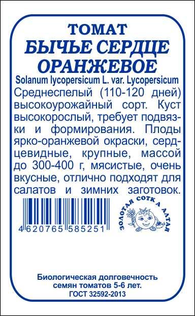 Томат Бычье сердце Оранжевое б/п /Сотка/ 0,05г/ среднесп. индет. 300-400г/*2000