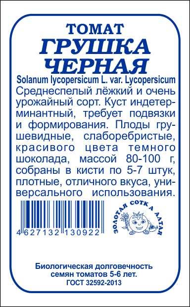 Среднеспелый сорт со стабильно высокой урожайностью и прекрасной лёжкостью. От всходов до созревания 110-115 дней. Растение индетерминантное, требует подвязки и формирования. Плоды слаборебристые, грушевидной формы, красивого цвета темного шоколада, массой 80-100 г, собраны в кисти по 5-7 штук, очень плотные, обладают великолепным вкусом. Сорт рекомендуется для непосредственного потребления и приготовления салатов, цельноплодного консервирования и переработки.