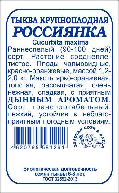 Тыква Россиянка б/п /Сотка/ 2 г (1,2-2кг)/*480