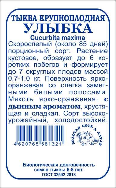 Тыква Улыбка б/п /Сотка/ 2 г/ скоросп. / куст.0,7-1,0 кг. дын.аром/*480