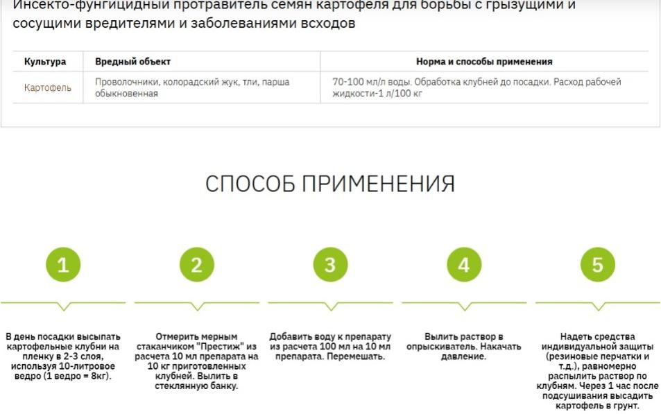 Комбинированная защита от болезней и вредителей; антистрессовый эффект стимулирования роста растения; ранняя защита от проволочника, медведки, личинок хрущей, совки; применяется 1 раз в сезон обрабатыванием клубней перед посадкой; широкий спектр защиты от всех видов листовой тли, трипсов, клопов; безопасность для полезных насекомых; исключение зависимости от погодных условий.