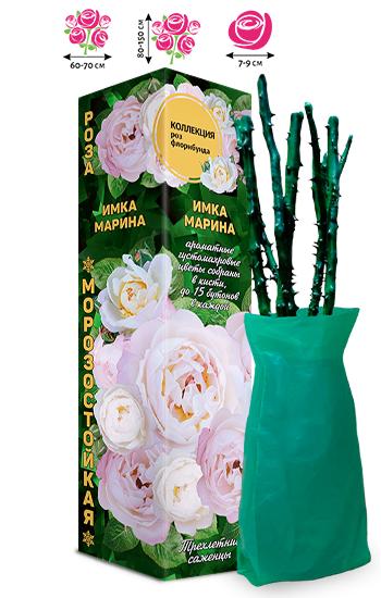 Куст с прямостоячими побегами, хорошо разветвленный, в высоту 80-150 см, а в ширину – 60-70 см. Листья крупные, темно-зеленые с глянцевой поверхностью. На стеблях имеется умеренное количество шипов. Цветение у сорта Имка Марина обильное, повторноцветущая. Бутоны кремовые с розово-фиолетовыми полосами. Цветы кремовые, с золотистым центром и розовым напылением по краям лепестков, густо-махровые, собраны в изящные многоцветковые соцветия. На один стебель приходится по 5-10 цветков с сильным ароматом. Диаметр каждого из них может варьироваться от 7 до 9 сантиметров. У розы хорошая устойчивость к болезням и дождю.