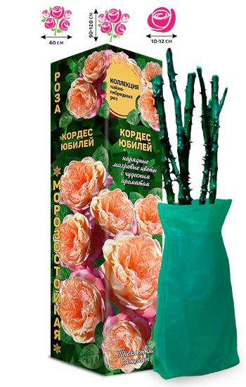 Куст Кордес Юбилей прямостоячий, мощный, вырастает до 120 см в высоту при ширине в 60 см. Побеги покрыты густо темно-зелеными листьями с полуглянцевой поверхностью. Округлые темно-малиновые бутоны расцветают в густомахровые, с плотно набитой серединкой, двухцветные: кремово-желтые с розово-красными крайними лепестками цветок, диаметром 10-12 см. Аромат интенсивный, с нотками ванили. Устойчива к дождю и болезням. Цветение обильное, повторное.