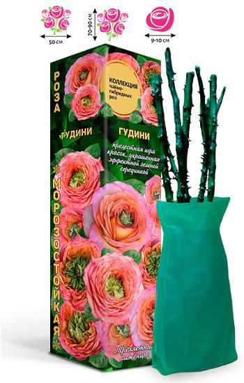 Зимостойкая, устойчивая к болезням. Густомахровые цветки диаметром 8-10 см чашевидной формы окрашены в различные оттенки оранжевого с розоватым отливом. напоминает старинные сорта роз своей пионовидной формой. Цветет почти непрерывно все лето и сентябрь. Аромат умеренный, классический. Куст высотой 80-100 см, на стеблях цветет один пышный бутон, побеги покрыты широкими ярко зелеными листьями с бордовыми прожилками. Листья гладкие, глянцевые, без зазубрин по краям. На стеблях есть небольшое количество шипов. Сорт подходит для срезки.