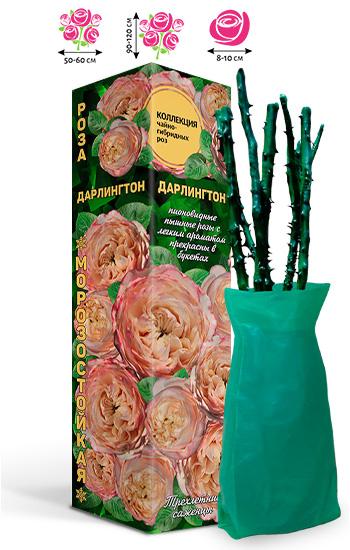 Кусты высотой 90-120 см. Листва крупная, насыщенно-болотного оттенка, продолговатой формы, с резными краями. Цветы в диаметре 8-10 см градиентной окраски: мягкий переход от кремово-персикового на крайних лепестках до пудрово-розового в центре, густомахровые, пионовидные, могут быть одиночными или в соцветиях по 1-3 цветков, долго сохраняются на кусте и в срезе. Аромат легкий, с фруктовыми нотами. Цветение повторноцветущее, продолжительное. Устойчива к дождю и зною.