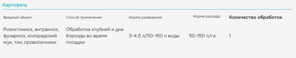 Трехкомпонентный протравитель картофеля от вредителей и болезней. Действующее вещество: 133 г\л ипродиона+100 г/л имидаклоприда+6,7 г/л дифеноконазола. Используется для борьбы с колорадским жуком, проволочником, тлей, антракнозом, ризоктониозом и фузариозом. Обеззараживает клубни и почву, защищает проростки. Начинает дйствовать в первые часы после обработки клубней при посадке. Предотвращает развитие нематод в зоне действия препарата. Проявляет высокую эффективность против ооспороза и фомоза картофеля. Не угнетает и не задерживает рост картофеля.