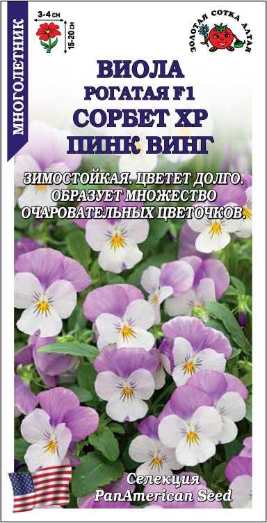 За необыкновенную бело-голубую расцветку гибрид получил золотую медаль международной выставки Fleuroselect. Относится к очень популярной среди профессиональных озеленителей серии «F1 Сорбет». Формирует компактный аккуратный кустик, усыпанный довольно крупными для рогатой виолы цветками (3,0-4,5 см). Благодаря раннему, обильному и непрерывному цветению, с мая по сентябрь на кустике распускается до 60 цветков. Гибрид идеально подходит для создания цветочного ковра в саду, оформления альпийской горки, выращивания на балконе или подоконнике. Особый национальный колорит приобретает растение, высаженное в цветочный горшок, расписанный под гжель. Предпочитает легкую почву. Размножается семенами и делением куста. При длительном выращивании наблюдается обильный самосев. Семена можно высевать ранней весной (от посева до начала цветения проходит 10-13 недель) и осенью, предпочтительнее с 10 августа по 10 сентября. При посеве осенью, после укоренения листовые розетки обрезают, удаляя цветоносы. Виола рогатая предпочитает умеренные температуры, поэтому ее рекомендуется высаживать в полутени, либо в комбинации с более высокими растениями, защищающими от перегрева. Отлично смотрится на полутенистой альпийской горке.