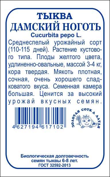Среднеспелый урожайный сорт. От всходов до плодоношения 110-115 дней. Растение кустового типа. Плоды желтого цвета, удлиненно-овальные, массой 3-4 кг, кора твердая. Мякоть плотная, сочная, очень хорошего сладковатого вкуса. Семенная камера большая. Семечки вкусные и ароматные, подходят для употребления в сыром и жареном виде. Сорт широко используется в кулинарии, ценится за высокий урожай масличных семян.