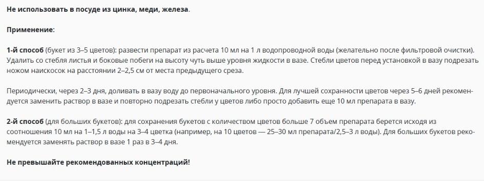 Препарат применяется для длительного продления жизни срезанных цветов (розы, хризантемы, циннии, лилии, пионы, ромашки, георгины, жасмин). Препарат малоэффективен для гербер, ирисов и гладиолусов.