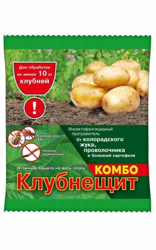 «Клубнещит Комбо» — это специальный бинарный комплекс для защиты картофеля от проволочника, колорадского жука и комплекса болезней. Эффективность подтверждена испытаниями: поврежденность проволочником снижается многократно, молодые растущие растения картофеля практически не повреждаются колорадским жуком и личинками в течение 2–2,5 месяца (дополнительного опрыскивания обычно не требуется), растения развиваются более здоровыми и формируют больший урожай. В его составе системный инсектицид «Дракор» и фунгицид «Максим».