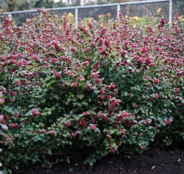 Плотный кустарник с дуговидными побегами, высота 90-100 и ширина 100-120 см. Листья тёмно-зелёные. Цветки розоватые невзрачные, цветёт в июне. Плоды - многочисленные округлые пурпурно-розовые ягоды, сохраняющиеся на кусте до зимы.